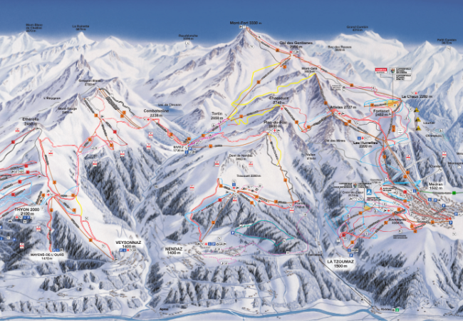 Bruson, Nendaz, La Tzoumaz, Veysonnaz, Thyon, Matterhorn, Zermatt, Aletsch Arena, Mont Blanc, Chamonix, Monte Rosa